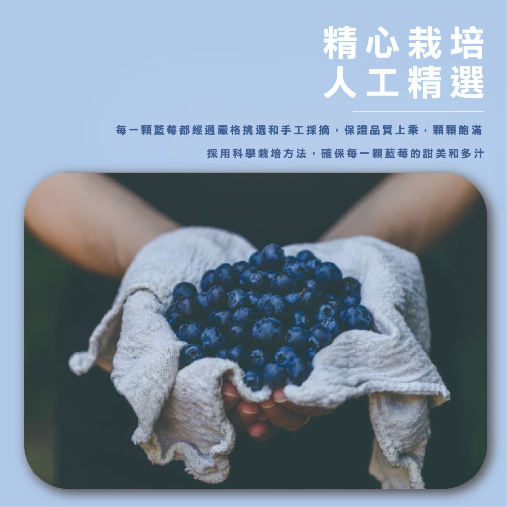 人工精選:每一顆藍莓都經過嚴格挑選和手工採摘,保證品質上乘,顆顆飽滿。
